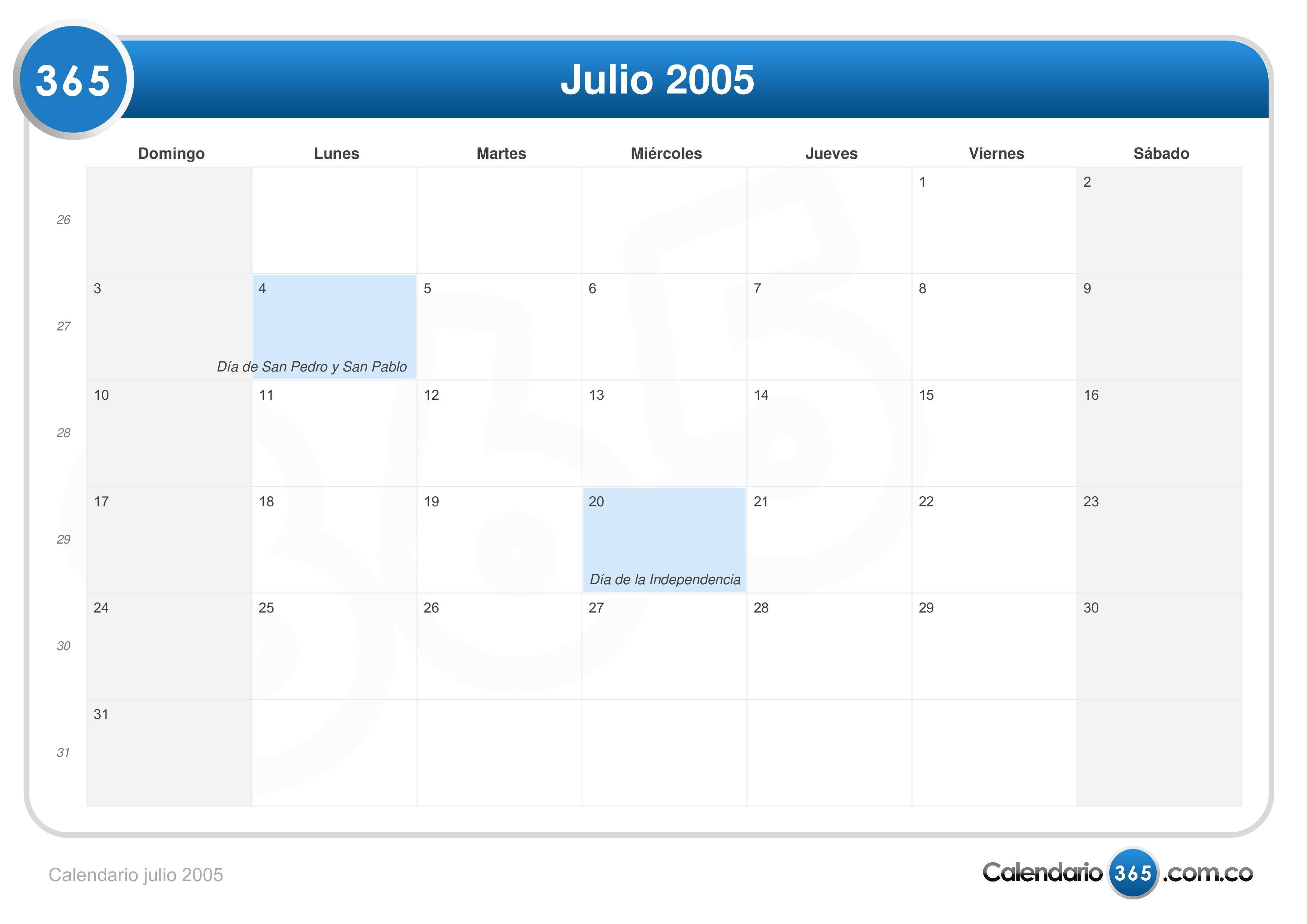 Consulta aquí el calendario mensual de julio del 2005. Este incluye los números de las semanas.| Semana | Do | Lu | Ma | Mi | Ju | Vi | Sá |