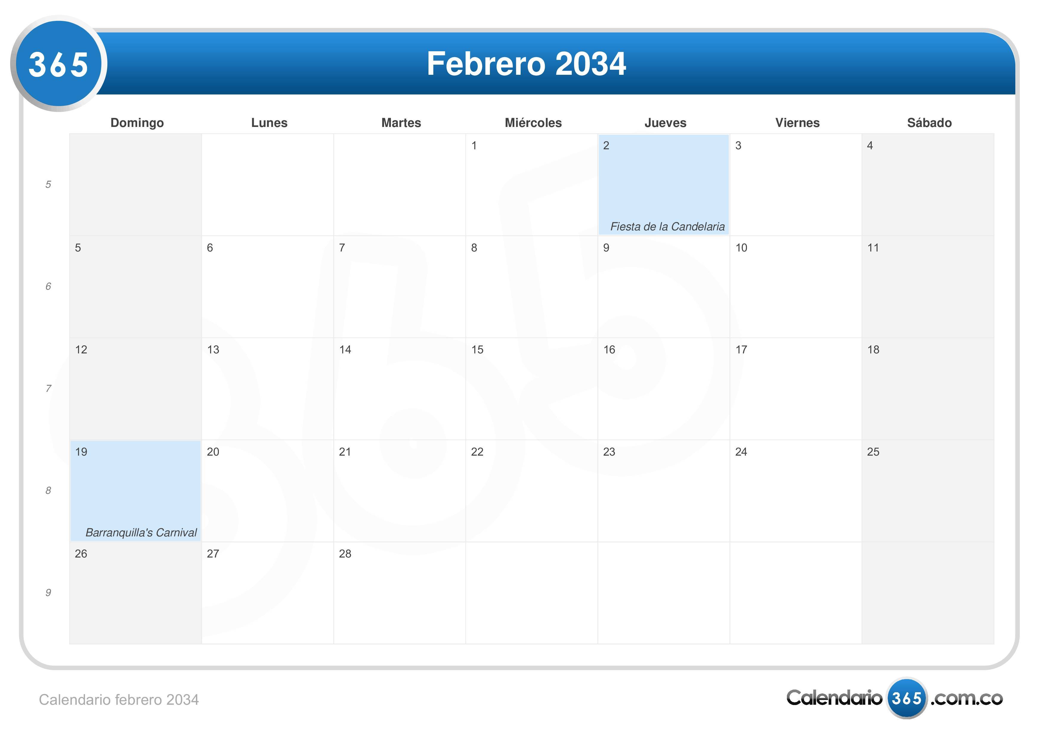 Consulta aquí el calendario mensual de febrero del 2034. Este incluye los números de las semanas.| 2 febrero | Fiesta de la Candelaria |