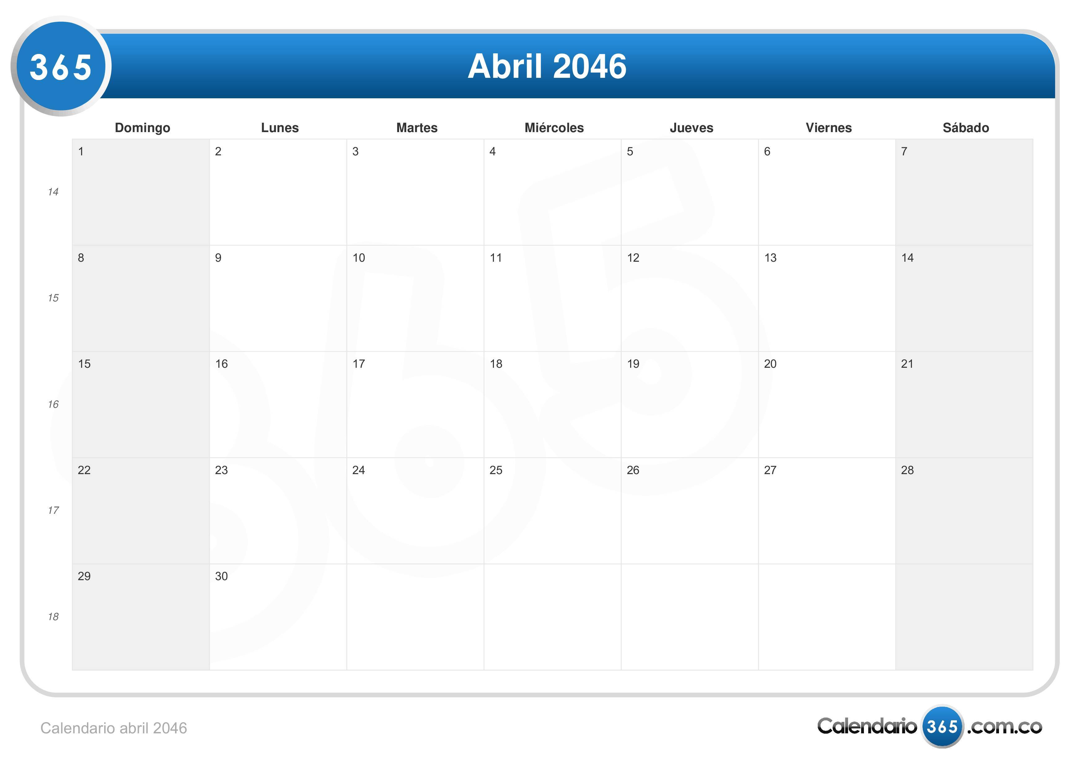 Calendario abril 2046 (Formato apaisado)Vaya al Calendario 2046.