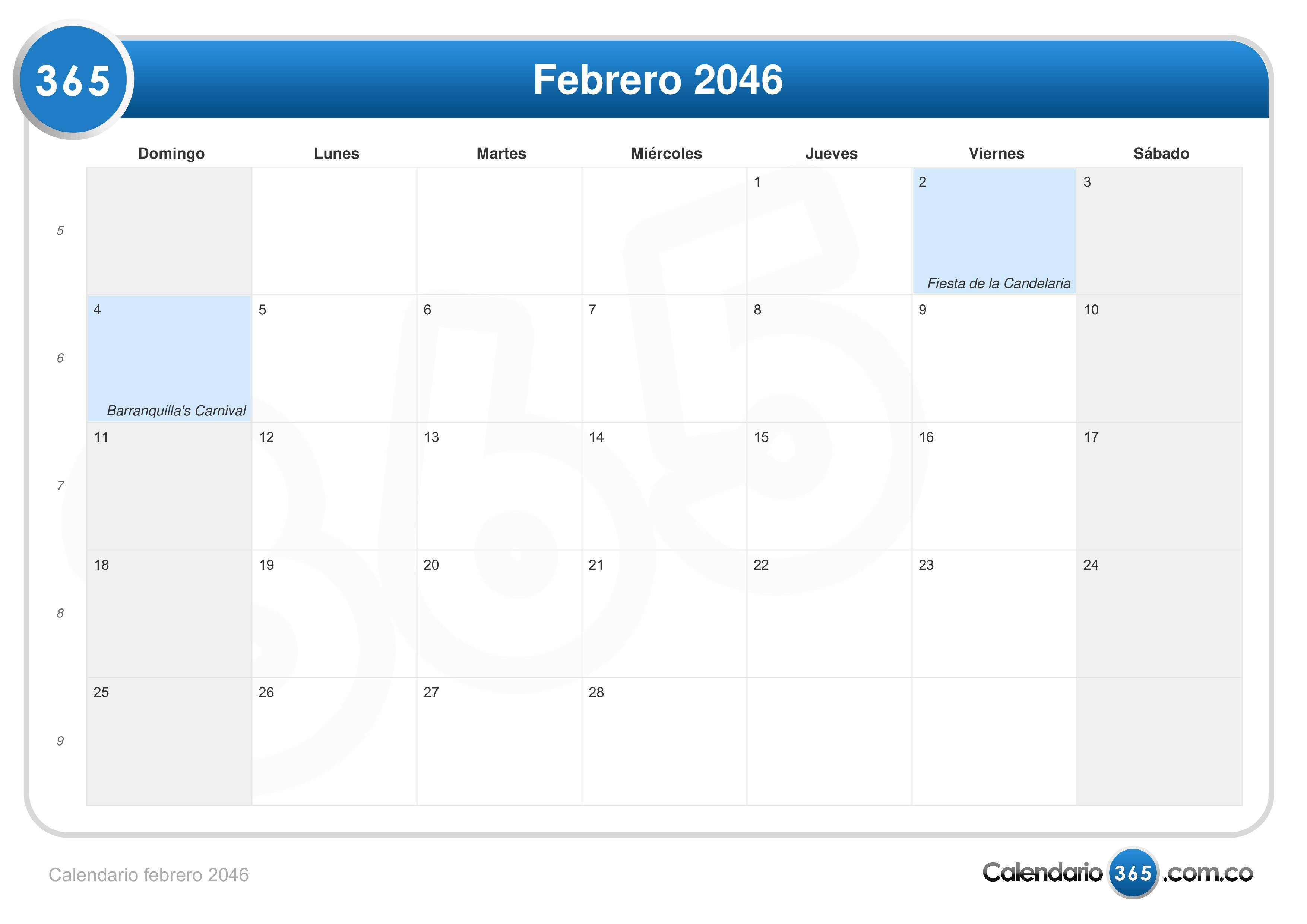 Consulta aquí el calendario mensual de febrero del 2046. Este incluye los números de las semanas.| 2 febrero | Fiesta de la Candelaria |