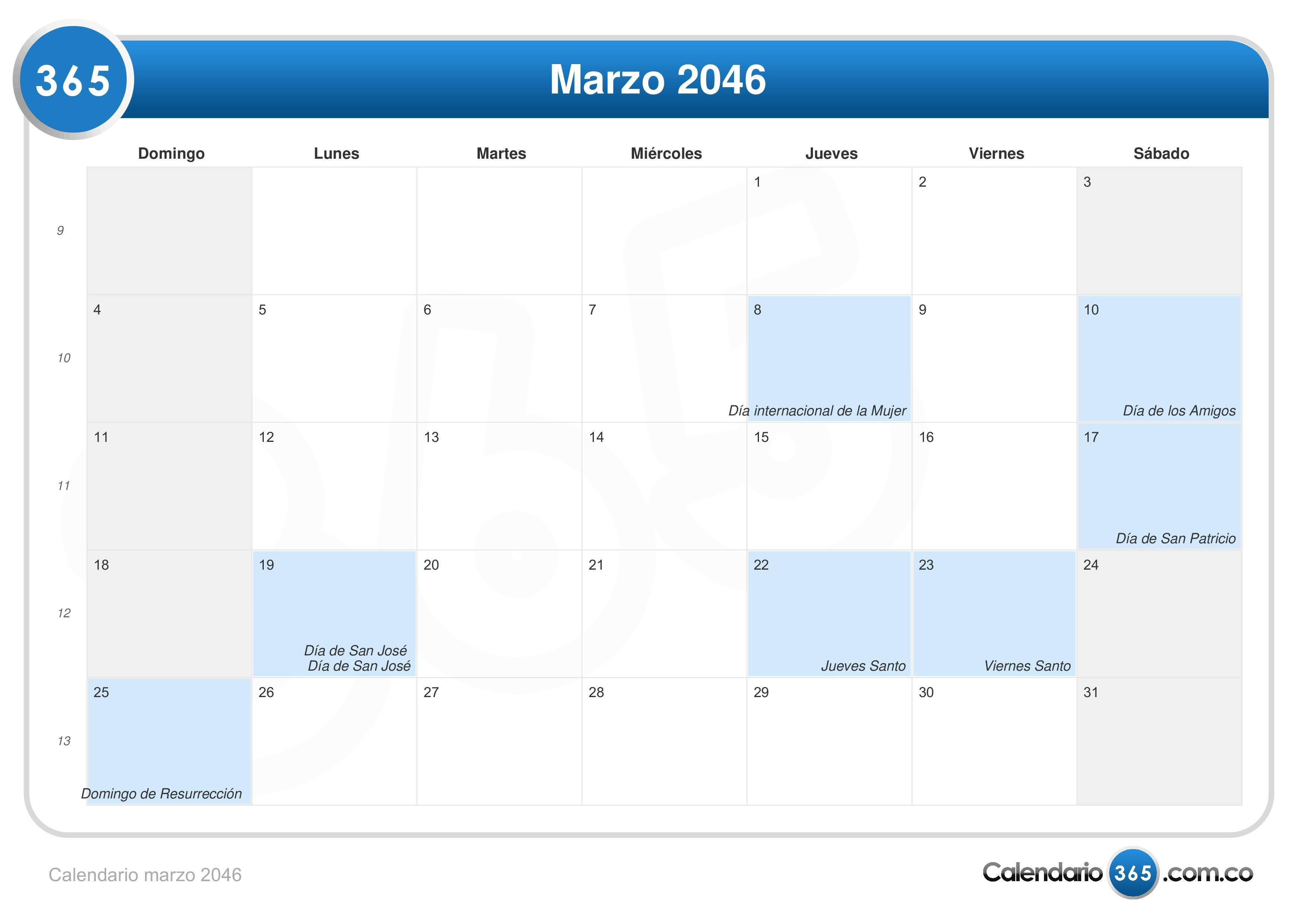 Consulta aquí el calendario mensual de marzo del 2046. Este incluye los números de las semanas.| 8 marzo | Día internacional de la Mujer |
